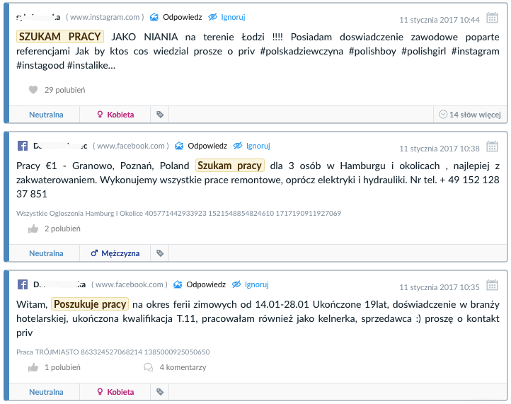 Przykładowe wypowiedzi w temacie “Szukam pracy”. Widok w panelu “wzmianki” SentiOne.