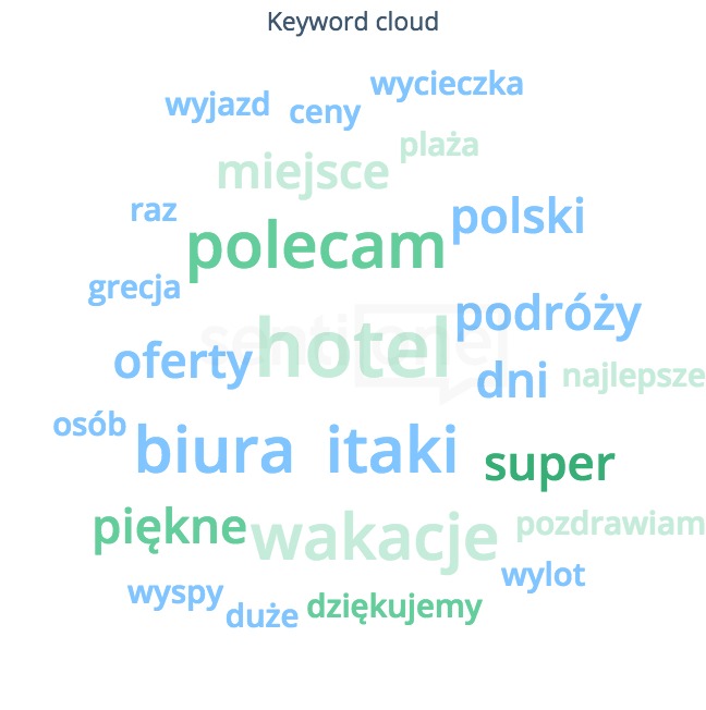 “Nie ważne jak mówią, byle mówili” to często eksploatowane hasło, niemniej jednak trudno wyobrazić sobie jego zastosowanie w sektorze usługowym. Branża turystyczna jest w tej kwestii wyjątkowo wrażliwa – jeden odwołany lot czy problematyczna obsługa hotelowa mogą silnie zaważyć na postrzeganiu firmy przez klientów i finalnie przełożyć się na ogólny spadek ich zaufania. Na przeciwległym biegunie w tej kwestii znajduje się biuro podróży Itaka, w którego słowach kluczowych znajdziemy mnóstwo superlatyw – takie frazy jak “najlepsze”, “piękne wakacje” czy “dziękujemy” mówią same za siebie. Chmura słów kluczowych pozwala szybko zorientować się jakie słowa najczęściej padają w kontekście naszej marki i jaki mają wydźwięk – pozwala to szybko i skutecznie dotrzeć do źródła ewentualnego problemu.