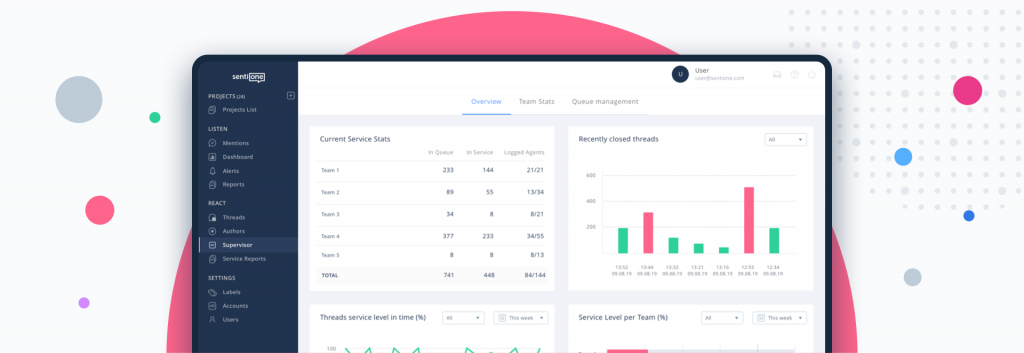 Z myślą o tych właśnie problemach (i nie tylko!) zaprojektowaliśmy Panel Supervisora w SentiOne React. Zapomnij o śledzeniu tuzinów wskaźników KPI w kilku różnych projektach: jednym kliknięciem uzyskasz dostęp do dokładnego podsumowania wydajności całego zespołu obsługi klienta. Wszystkie wskaźniki i metryki zawarte są w jednym widoku – wystarczy rzut oka, żeby dowiedzieć się, ile wątków zostało zamkniętych, ilu pracowników jest online, jaki jest ich czas odpowiedzi, oraz ile spraw wciąż czeka na rozwiązanie. Potrzeba Ci więcej informacji? Bez problemu – wszystkie widoki można dowolnie modyfikować. Wskaźniki aktualizowane są też bez przerwy, w czasie rzeczywistym, co pozwala na przewidywanie problemów związanych z nadmiernym obciążeniem pracowników i rozwiązywanie ich, zanim nastąpią.