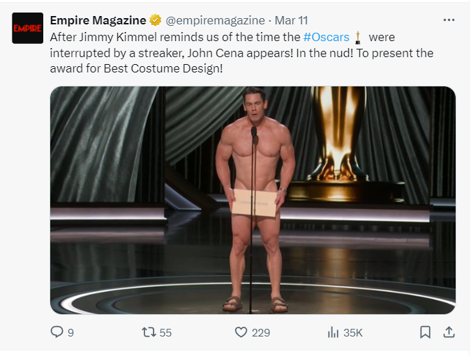 Gdy amerykański zapaśnik i aktor John Cena wchodził na scenę, by ogłosić zwycięzcę w kategorii Kostiumy (oczywiście „Poor things”), mogło się wydawać, że szykuje się skandal, o którym Internet będzie huczał tygodniami. Anegdota związana z wydarzeniami z 1974 roku (gdy nagi mężczyzna niespodziewanie wbiegł na scenę) sprawiła jednak, że publiczność zgromadzona w Dolby Theatre przywitała niemal nagiego Johna jedynie ze śmiechem. Na pewno z tego występu szczególnie zapamiętamy kopertę przykrywającą części intymne niczym liść figowy i słowa „Costums. They are so important. Maybe the most important thing there is”.