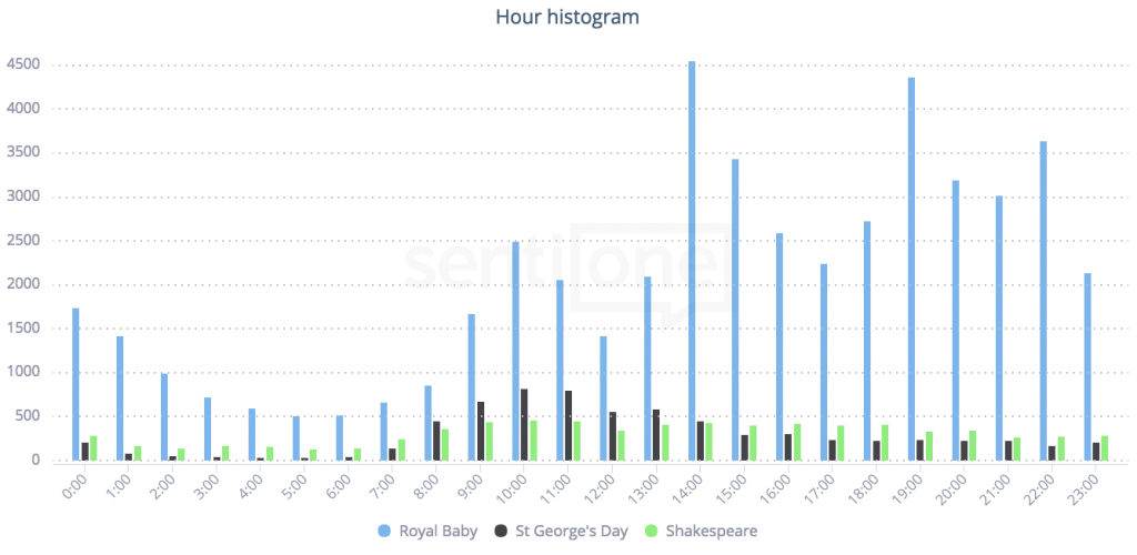 Porównanie liczby wzmianek nt. „Royal Baby”, „St George’s Day”, „Shakespeare” w jęz. angielskim. Widok: histogram godzinowy SentiOne.