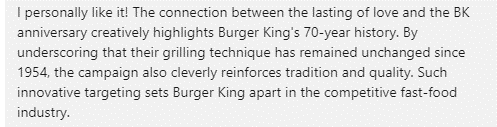 Autorzy tej kreacji (agencja marketingowa z Buenos Aires) wskazali, że „stare płomienie utrzymują swoją perwersyjną pasję przy życiu po tych wszystkich latach tak gorącą jak pierwszego dnia, tak jak Burger King jest grillowany w płomieniach od 1954 roku”. Analogia jest niezwykle trafna i zdecydowanie trzeba pochwalić twórcę tego hasła, co podtrzymują internauci w komentarzach: