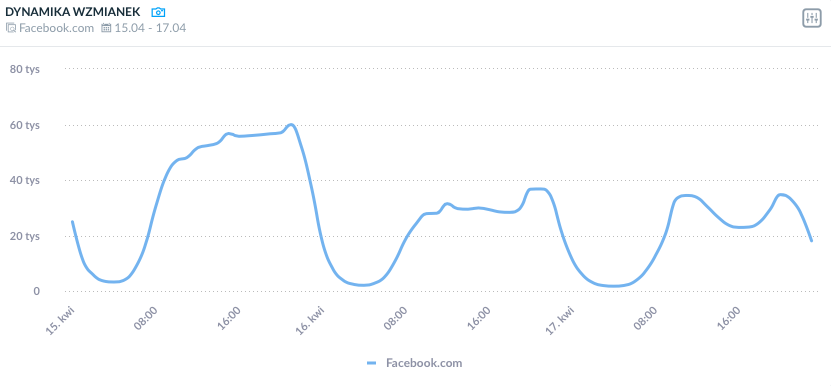 Wykres dynamiki wszystkich publicznych wzmianek na Facebooku, opublikowanych w języku polskim w dniach 15-17.04.2017 r.