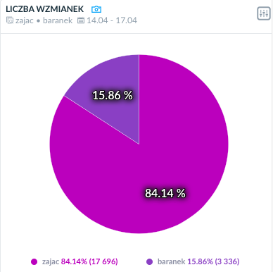 Jak się okazuje, od Wielkiego Piątku do lanego poniedziałku w sieci zdecydowanie zajączek zdominował baranka. Zaskoczeni? W tym czasie o długouchym, czasem czekoladowym zwierzaku wspomnieliśmy online ponad 17,5 tysiąca razy! Baranek zanotował nieco ponad 3 tysiące wypowiedzi na swój temat.