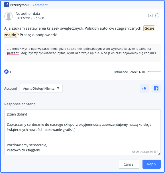 W SentiOne opracowaliśmy rozwiązanie wspierające prowadzenie takich działań – SentiOne React, technologię pozwalającą na znalezienie istotnych wzmianek przy użyciu konkretnych fraz kluczowych, a następnie zaangażowanie się w dyskusję w tym samym kanale, gdzie marka jest (lub nie jest oczekiwana) przez klienta – najlepiej w spersonalizowanej formie.