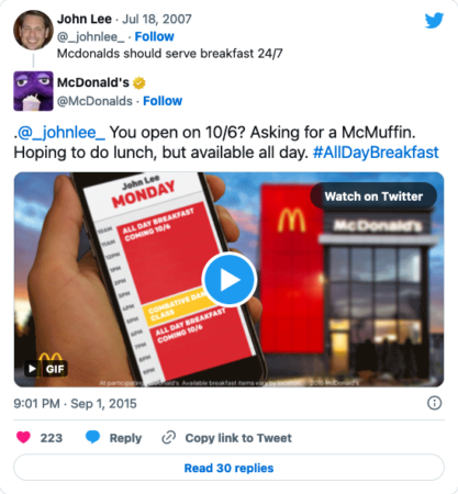 McDonald’s identified the want, and some could say need, for all-day breakfast by not only seeing their direct mentions, but the larger conversation and sentiment. They could quantify the customer feelings through data. Thus, they launched all-day breakfast, showing the audience they’re listening, and letting them feel that, even as a worldwide corporation, McDonald’s still responds to real human feedback.