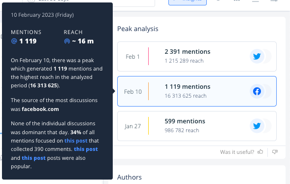 Check the most important events from last week or month. Our algorithm automatically detects days with the highest number of mentions, prepares a quick analysis, and shows the most relevant days and sources where the buzzing was most active.