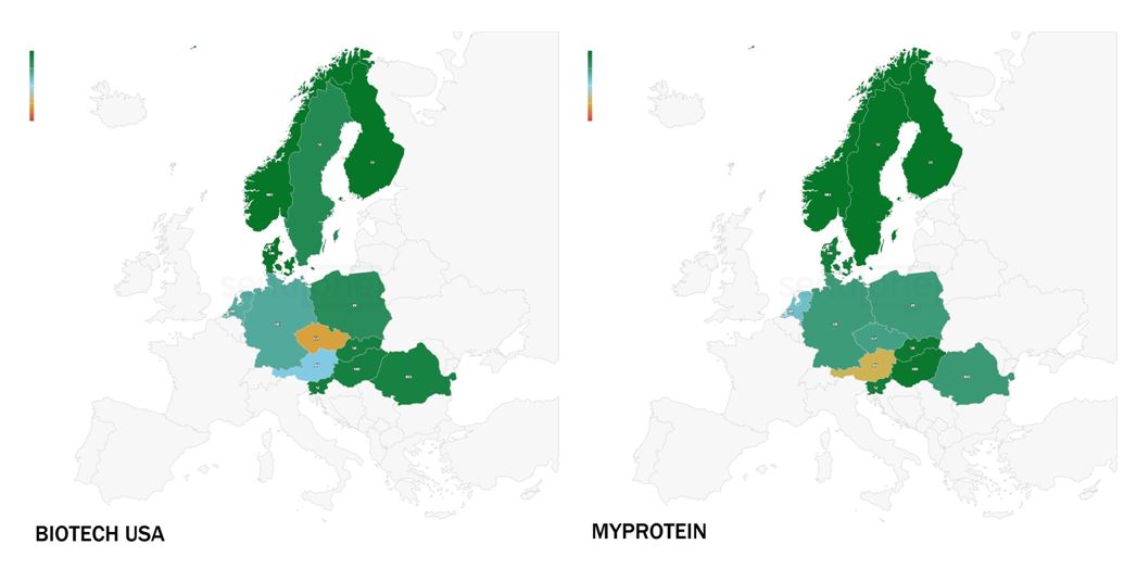 BioTech USA’s online reputation could use some uplifting in Checz Republic, while MyProtein does not perform well in Austria in terms of positive online mentions and publications (the greener the area gets, the more positive the online brand perception is).