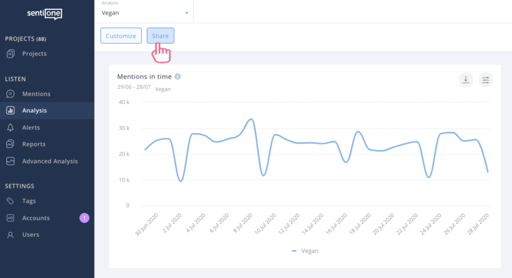 This one of those features that caused the “A-ha!” moment in our Product team. Simple to implement, but genius in results! Once you have created your project, you go into the Analysis tab and look for interesting insights. The usual stuff – mentions over time, look for any interesting spikes, read through some top mentions, check out the sentiment analysis… and you found it! You found the one piece of information that will make your manager/client/colleague/agency smile and clap their hands. Simply click at the ‘Dashboard Sharing’ option on the top left corner, copy the link and send it to whoever might be interested! The best part – they don’t need to be SentiOne users in order to access the dashboard!