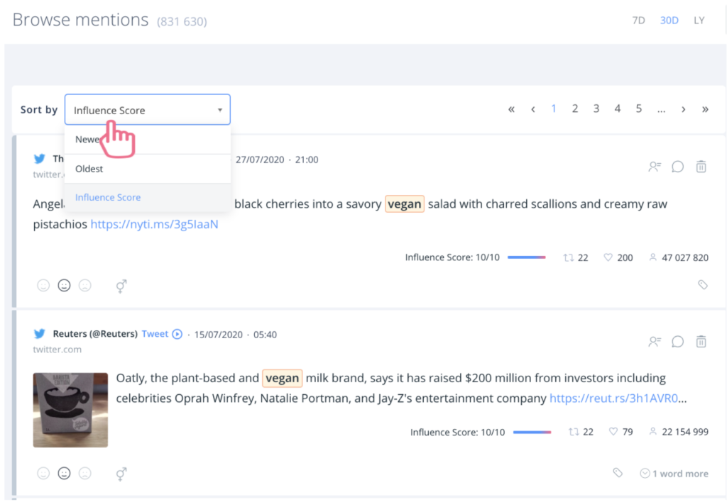 If you are monitoring the internet for a popular brand, viral campaign or a social subject that is currently trending (have you ever tried searching for coronavirus keywords?), you will most likely face a wall of endless mentions. We get it, not everyone has all the time in the world to read through every online discussion! That is why we have implemented a new filter in place – influence score! By selecting it, you will see which posts, comments and mentions have the highest reach.