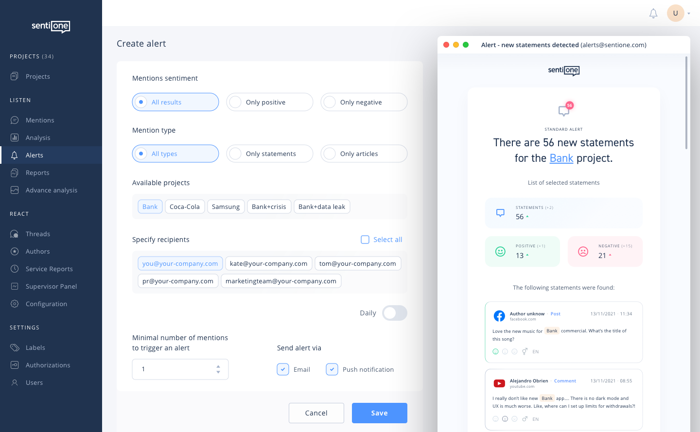 Stwórz alerty nowych wzmianek dla każdego z projektów. Zdecyduj czy chcesz otrzymywać powiadomienia codziennie, czy po przekroczeniu konkretnej liczby wiadomości.